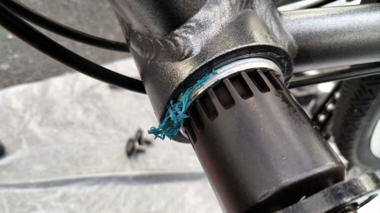 こちらは17000km程度使用したTB1のボトムブラケットのベアリングのカバー(シール面)を剥がした様子です。私は純正ボトムブラケットがどれくらい使えるか、ということが気になったので再度元に戻して使用していました(フレーム破損の恐れがあるためボトムブラケットは余計に何度も交換はしない方が良いと思いますが、本当に今交換することが適切なのか確信が持てなかったため、こんなことをしていました)。おそらくこちらにはグリスが注入されていた(ブルーに見えます)のだと思いますが、もうあまり残っていない様子。ベアリング表面には、少し傷(錆かもしれません)のようなものが見られます。軸を手で回してみると、若干の摩擦音。